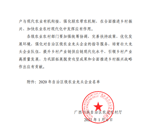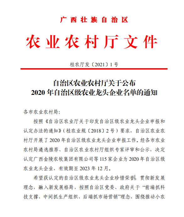 2021年1月6日 ,廣西壯族自治區(qū)農(nóng)業(yè)農(nóng)村廳公布了最新的2020 年自治區(qū)級農(nóng)業(yè)龍頭企業(yè)名單,其中包括 14個市的115家企業(yè)。本次遴選由各市農(nóng)業(yè)農(nóng)村局、自治區(qū)農(nóng)業(yè)農(nóng)村廳組織專家評審和公示,并最終決定。因廣西強壽藥業(yè)集團強化“龍頭企業(yè)+企業(yè)+基地+農(nóng)戶”的模式帶動周邊農(nóng)戶從事中草藥種植,扶助農(nóng)民走上致富之路成績顯著。本次榮獲“自治區(qū)級農(nóng)業(yè)龍頭企業(yè)”殊榮。