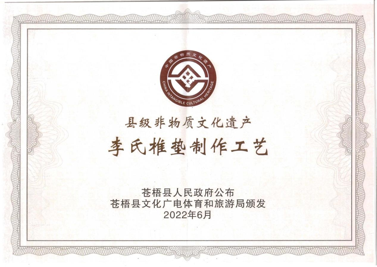 李氏椎墊制作工藝,于2022年6月被列入縣級非物質文化遺產,證書由蒼梧縣人民政府公布,蒼梧縣文化廣電體育和旅游局頒發(fā)。