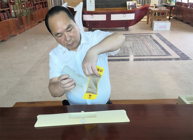 李氏椎墊制備主要技藝特點要求獨特,由外套及裝在外套內帶槽孔的固定器和固定在固定器槽孔內的藥囊組成。藥囊是由入地麝香、射干、滿山香、仙茅、兩面針、狼毒、祈艾的有效成分經加工制成。藥囊由遠紅外自發(fā)熱材料和中草藥,經利用現(xiàn)代精制而成,內容物為棕色至棕褐色的紊狀物,具有特殊植物芬芳氣味。藥囊大小規(guī)格可以根據固定器槽孔大小生產不同的規(guī)格型號。固定器為實木或高密度聚乙烯保護層及矯正器械,分五種型號根據不同的部位、不同的人群體型而選用。外套通常選用結實耐用的彈性透氣紡布制作。